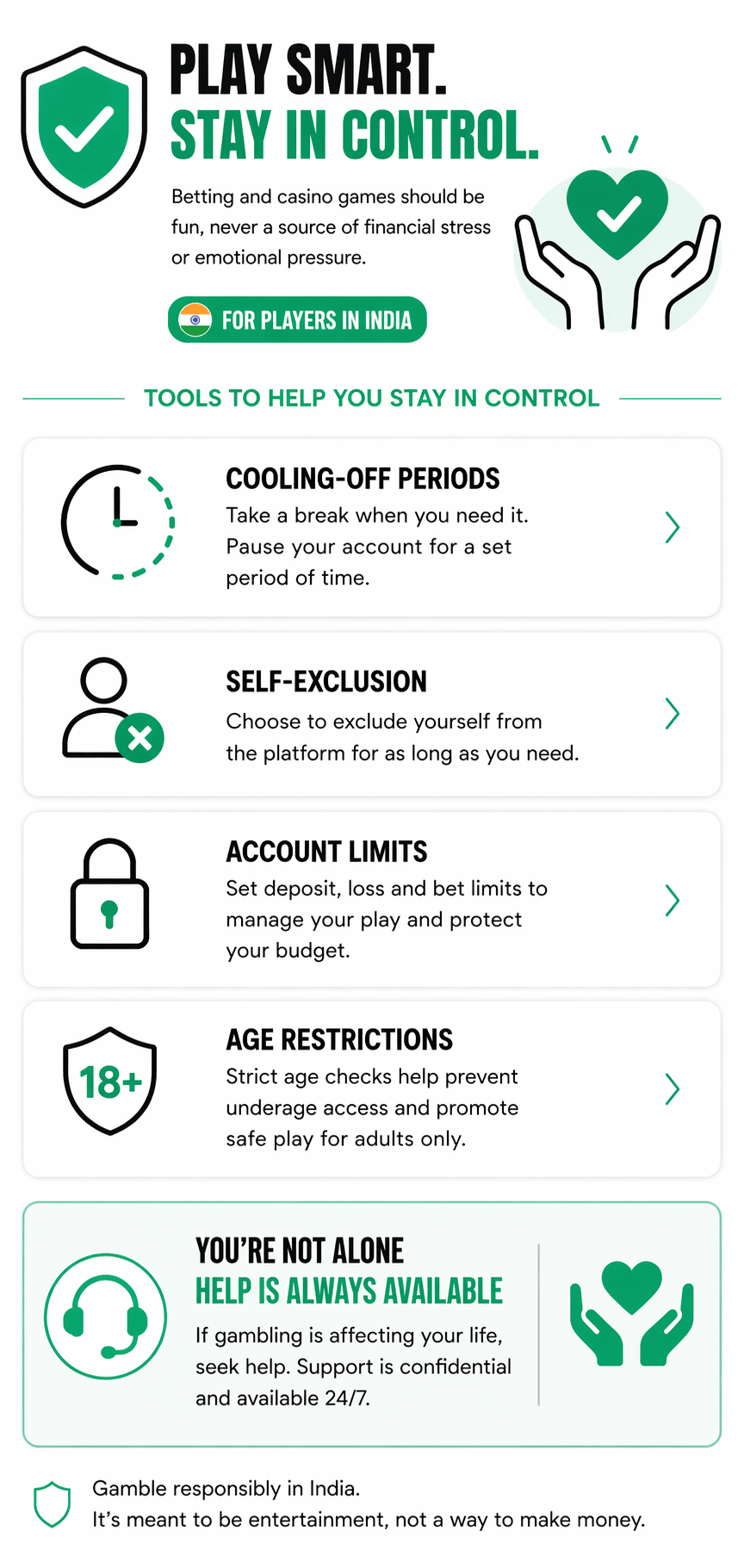 हे प्लॅटफॉर्म किमान १ वर्षाच्या कालावधीसाठी स्वयं-बहिष्काराची (सेल्फ-एक्सक्लूजन) सुविधा देखील देते, जो सट्टेबाजी किंवा कॅसिनो खेळातून अधिक काळ दूर राहू इच्छिणाऱ्यांसाठी एक महत्त्वाचा पर्याय आहे. याव्यतिरिक्त, खेळाडू सट्टेबाजीच्या मर्यादांची विनंती करू शकतात आणि वयाची पडताळणी व अल्पवयीन संरक्षणावर स्पष्ट लक्ष केंद्रित केले आहे.
