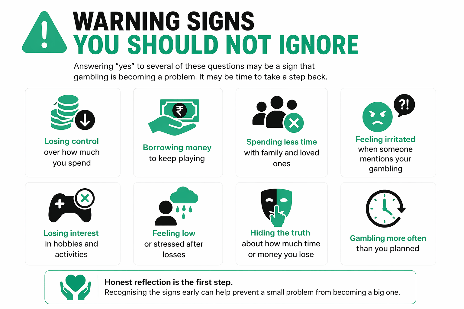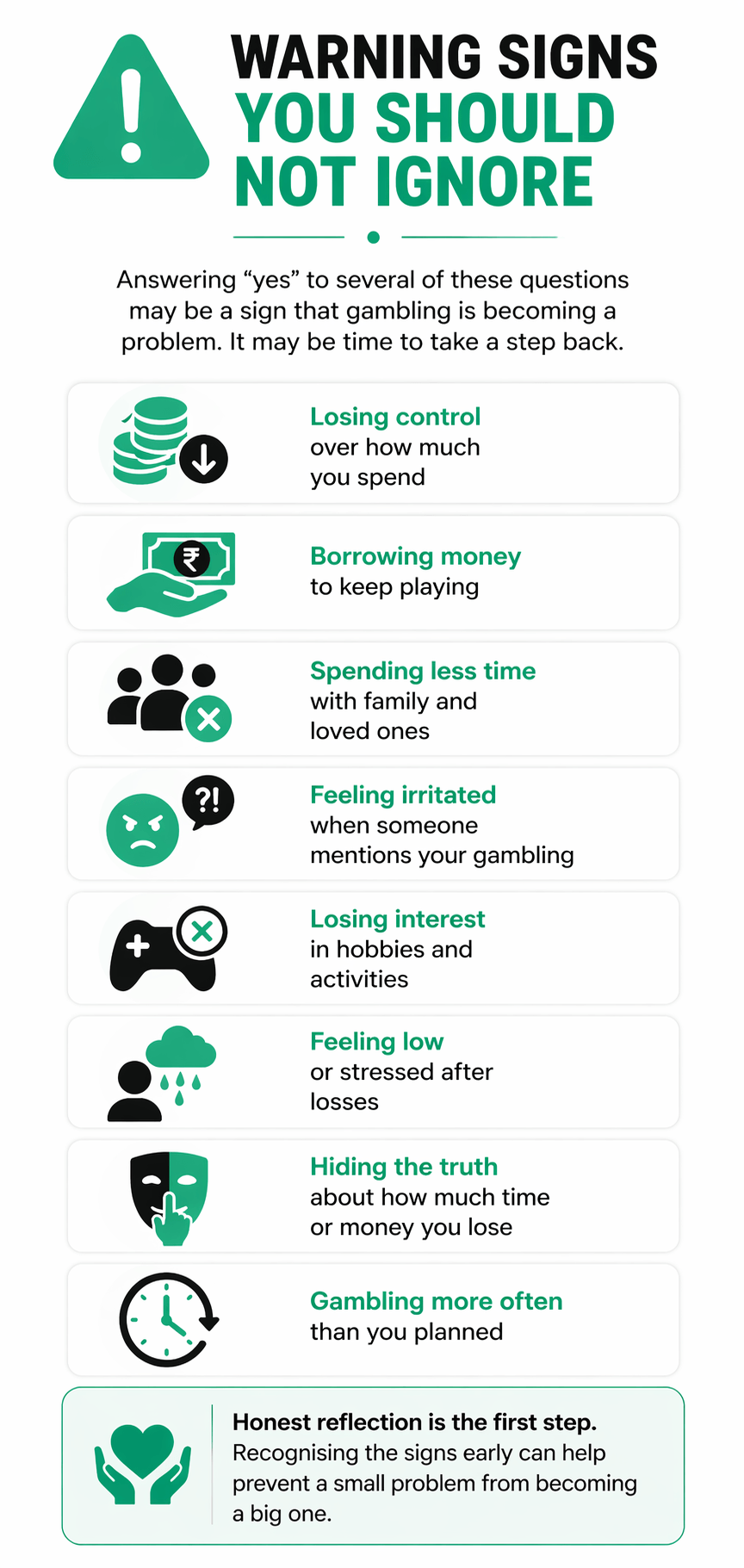 खर्चावर नियंत्रण गमावणे, खेळत राहण्यासाठी पैसे उधार घेणे आणि जुगार किंवा कॅसिनोच्या खेळामुळे कुटुंबासोबत कमी वेळ घालवणे, ही काही प्रमुख धोक्याची चिन्हे आहेत. हे अधिक भावनिक स्वरूपातही दिसून येऊ शकते, जसे की कोणी तुमच्या जुगाराचा उल्लेख केल्यावर चिडचिड होणे, पूर्वी आवडणाऱ्या छंदांमधील रस कमी होणे किंवा नुकसान झाल्यावर निराश वाटणे.